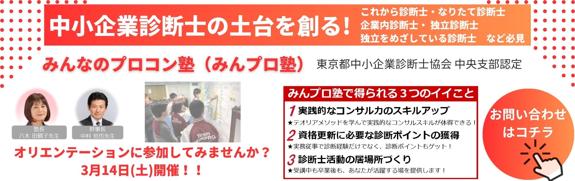 中小企業診断士の方向けに、プロのコンサルタントとしてのスキルやテオリア・メソッドを伝授する『みんなのプロコン塾』(略称:みんプロ塾)を実施しています。みんプロ塾は、東京都中小企業診断士協会中央支部認定のマスターコースです。